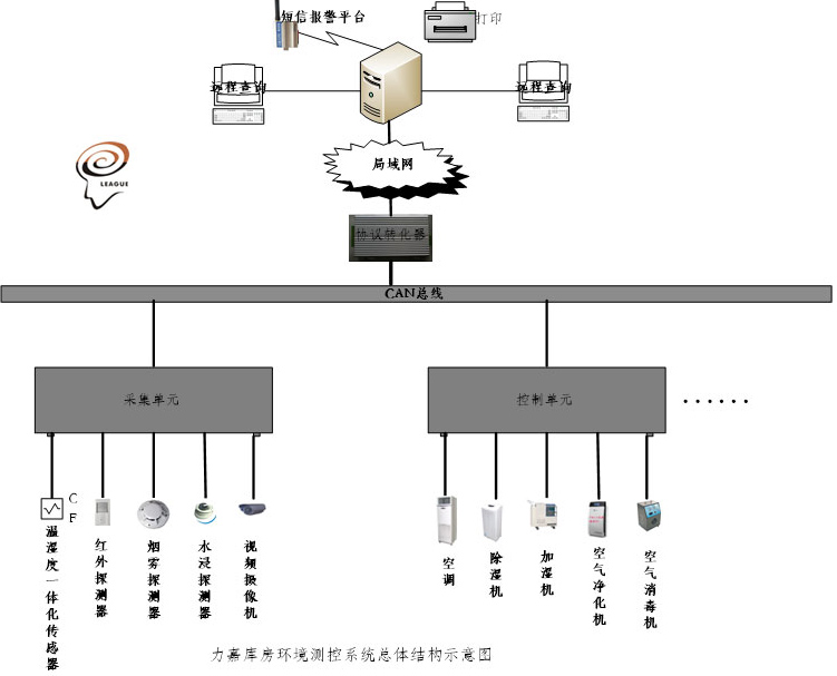 庫房安全保護集成軟件(以下簡稱軟件)利用現代計算機技術、傳感器技術、無線技術、電子技術以及單片機技術等,自動監測環境的溫濕度數據、火警、盜警和水浸等信息,并根據軟件設定,自動控制相應外圍設備,實現所控區域環境的恒溫恒濕控制,對各種報警信息以多種形式進行報警,包括以短信形式進行報警和以短信形式進行遠程查詢和遠程控制。軟件采用總線結構、模塊化設計,運行安全可靠,設計靈活,擴充方便,不但可以檢測環境的溫濕度,還可以檢測環境的煙霧、非法入侵和浸水等報警信息參數,并控制相應的外圍設備。 本軟件包括主控軟件和網絡查詢終端軟件(包括客戶端版和WEB版)兩部分。主控臺提供軟件設置,包括用戶及權限設置、庫房、控制器、設備和傳感器的設置以及控制周期、控制模式等相關參數的設置。主控軟件根據采集環境的溫濕度、火警、盜警和水浸等數據和設備狀態并自動控制相應外圍設備的動作。網絡查詢終端軟件功能與主控軟件類似,主要實現遠程系統工作狀態的查詢以及控制,它的遠程控制功能需要通過主控軟件才能實現。